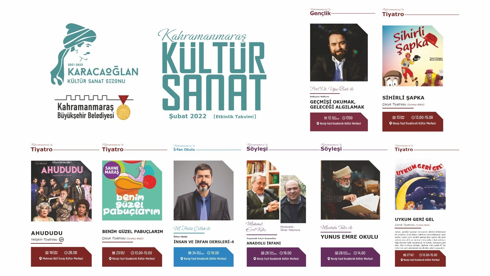 Şubat Kültür Sanat etkinlikleri kapsamında ay boyunca birçok tiyatro oyunu izleyicilerle buluşacak. Etkinlik takvimi kapsamında 13 Şubat Pazar günü ‘Sihirli Şapka’ isimli çocuk oyunu sahnelenecek. 13.00 ve 15.00’da iki seans şeklinde sahnelenecek oyun Necip Fazıl Kısakürek Kültür Merkezi’nde miniklerle buluşacak. Kültür Sanat etkinlikleri kapsamında ‘Ahududu’ isimli yetişkin tiyatrosu da Mehmet Akif Ersoy Kültür Merkezi’nde sanatseverlerle buluşacak. 18 Şubat Cuma günü sahnelenecek oyun saat 20.00’da başlayacak. Etkinlik takvimi kapsamında düzenlenecek diğer bir programda ise 20 Şubat Pazar günü ‘Benim Güzel Pabuçlarım’ isimli çocuk oyunu Necip Fazıl Kısakürek Kültür Merkezi’nde miniklerle buluşacak. Sahne Maraş öğrencilerinin sahneleyeceği oyun iki seans şeklinde saat 13.00 ve 15.00’da izleyici karşısına çıkacak. Şubat Kültür Sanat etkinlikleri 27 Şubat Pazar günü sahnelenecek ‘Uykum Geri Gel’ isimli çocuk oyunuyla noktalanacak. İki seans şeklinde saat 13.00 ve 15.00 saatlerinde sahnelenecek oyun Necip Fazıl Kısakürek Kültür Merkezi’nde miniklerle buluşacak.