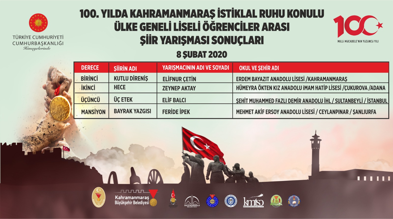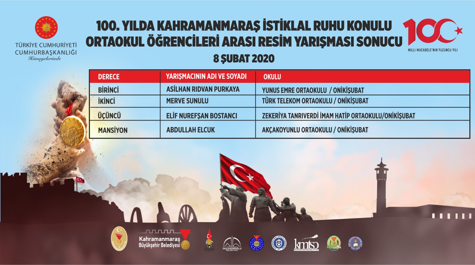 Kahramanmaraş’ın düşman işgalinden kurtuluşunun 100. Yılı kutlama etkinlikleri kapsamında düzenlenen resim ve şiir yarışmaları sonuçlandı. Yarışmalarda lise ve dengi okullar arasında düzenlenen şiir yarışmasına 234 şiir, yetişkinler arasında düzenlenen şiir yarışmasına 448 şiir ve resim dalında ise 318 eser katıldı.