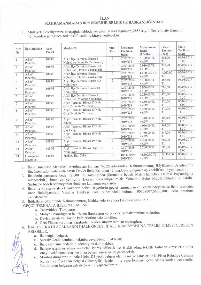» Mülkiyeti Belediyemize ait ekte ilanda yer alan taşınmazlar ihale ile kiraya verilecektir
