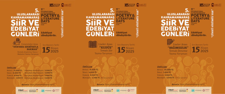 5. Uluslararası Kahramanmaraş Şiir ve Edebiyat Günleri kapsamında düzenlenen "Üniversiteler Arası Dünyaya Edebiyatla Bakmak Konulu Araştırma Yazısı/Araştırma Makalesi" ile "Liseler Arası Kudüs Temalı Şiir Yazma" yarışmalarının son başvuru günü 15 Nisan 2025 tarihine uzatılmıştır.