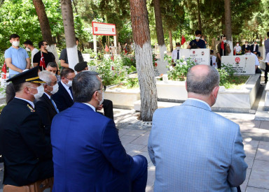 15 Temmuz Demokrasi ve Milli Birlik Günü münasebetiyle düzenlenen program çerçevesinde Şeyh Adil Mezarlığı’nda eski ve yeni şehitlik ziyaretinde bulunarak dualar edilip şehit mezarlarına karanfil bırakıldı.