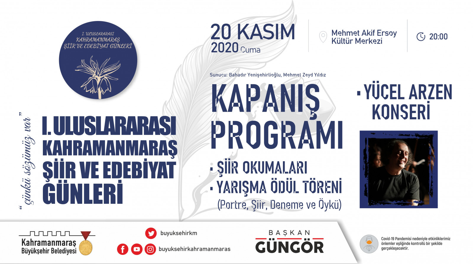 20 Kasım Cuma, 20.00’da gerçekleştirilecek etkinlikle ilgili olarak, “Erdem Bayazıt Şiir Ödülü, Nuri Pakdil Araştırma Ödülü, Rasim Özdenören Öykü Ödülü, Tahsin Yücel Roman Ödülü, Cahit Zarifoğlu Çocuk Edebiyatı Ödülü, Bahaettin Karakoç Dijital Edebiyat Kültür Platformu Ödülü, Abdurrahim Karakoç TV Edebiyat Programı Ödülü ve Yedi Güzel Adam Jüri Özel Ödülü sahiplerini bulacak.Mehmet Akif Ersoy Kültür Merkezi’nde, sunuculuğunu Bahadır Yenişehirlioğlu ile Mehmet Zeyd Yıldız’ın yapacağı etkinlikte sanatçı Yücel Arzen Kahramanmaraşlılarla buluşacak” ifadeleri kullanıldı. Programların pandemi tedbirleri kapsamında gerçekleştirileceğinin de belirtildiği açıklamada ayrıntılı bilgilerin https://www.kmedebiyatgunleri.com/ adresinden paylaşıldığı ifade edildi.