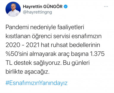 Gerçekleştirilen destek ile ilgili sosyal medya hesabından paylaşımda bulunan Başkan Güngör, “Pandemi nedeniyle faaliyetleri kısıtlanan öğrenci servisi esnafımızın 2020 – 2021 hat ruhsat bedellerinin %50’sini almayarak araç başına 1.375 TL destek sağlıyoruz. Bu günleri birlikte aşacağız. Esnafımızın yanındayız” ifadelerini kullandı. Verilen destek ile ilgili olarak Kahramanmaraş Öğrenci Servisçileri Odası Başkanı Sefa Şavkılı da Büyükşehir Belediye Başkanı Hayrettin Güngör’e teşekkür etti.