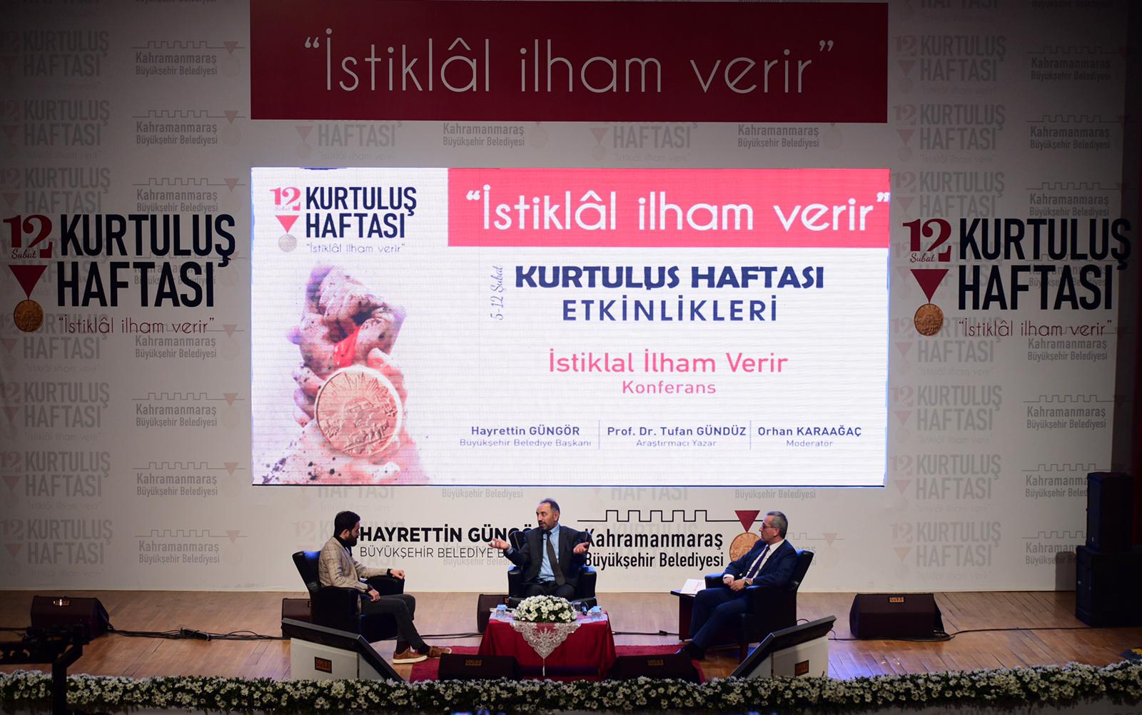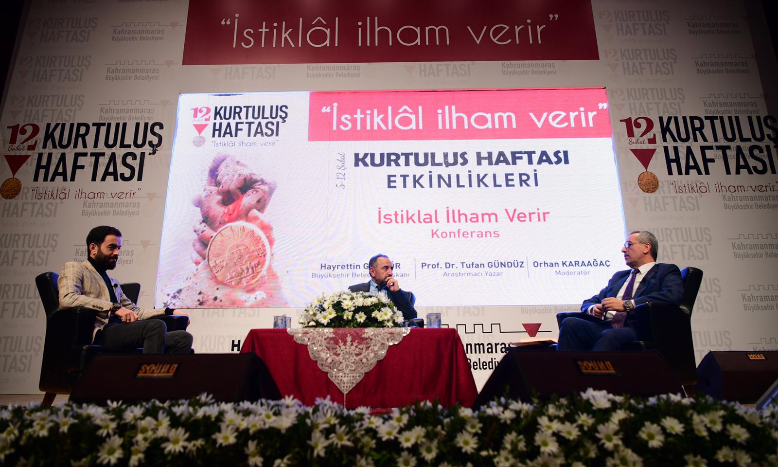 Kahramanmaraş Büyükşehir Belediyesi 12 Şubat Kurtuluş Haftası etkinlikleri kapsamında İstiklal İlham Verir konferansı gerçekleştirildi. Mehmet Akif Ersoy Kültür Merkezi’nde gerçekleştirilen programa Büyükşehir Belediye Başkanı Hayrettin Güngör, Vali Ömer Faruk Coşkun, il müdürleri, meclis üyeleri ve vatandaşlar katıldı. Moderatörlüğünü Orhan Karaağaç’ın gerçekleştirdiği programda Araştırmacı Yazar Prof. Dr. Tufan Gündüz ve Büyükşehir Belediye Başkanı Hayrettin Güngör, şehrin istiklal mücadelesi hakkında konuştu.