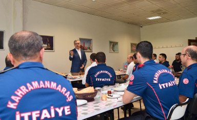 Kahramanmaraş Büyükşehir Belediye Başkanı Hayrettin Güngör, İtfaiye Daire Başkanlığı’nda çalışanlar ile bir araya geldi. AK Parti İl Başkan Yardımcısı Ali Köfte’nin de katıldığı ziyarette ekiplerle bir süre sohbet eden Başkan Güngör, şehir içinde ve dışında gösterdikleri başarılar dolayısıyla itfaiye personeline tebriklerini iletti. Yeni hizmet birimlerine ilişkin değerlendirmelerde bulunan Güngör açıklamasında, “Bugün İtfaiye teşkilatımızla buluştuk. İtfaiyemizin her zaman hazır olması için altyapı, insan kaynakları, araç gereç bunların değerlendirmesini yaptık. Şehrimizde yangın noktasında alınabilecek tüm önlemleri alıyoruz, almayı da sürdüreceğiz” diye konuştu.