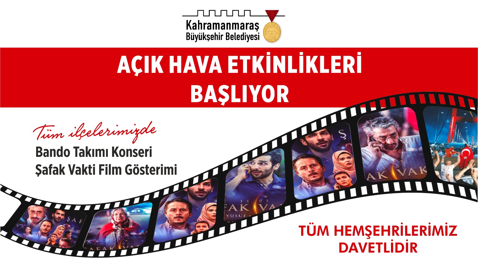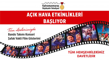 Kahramanmaraş Büyükşehir Belediyesi Açık Hava Etkinlikleri başlıyor. Tüm ilçelerde gerçekleştirilecek programlar kapsamında Büyükşehir Bando Takımı konser verecek ve Şafak Vakti filminin gösterimi yapılacak.