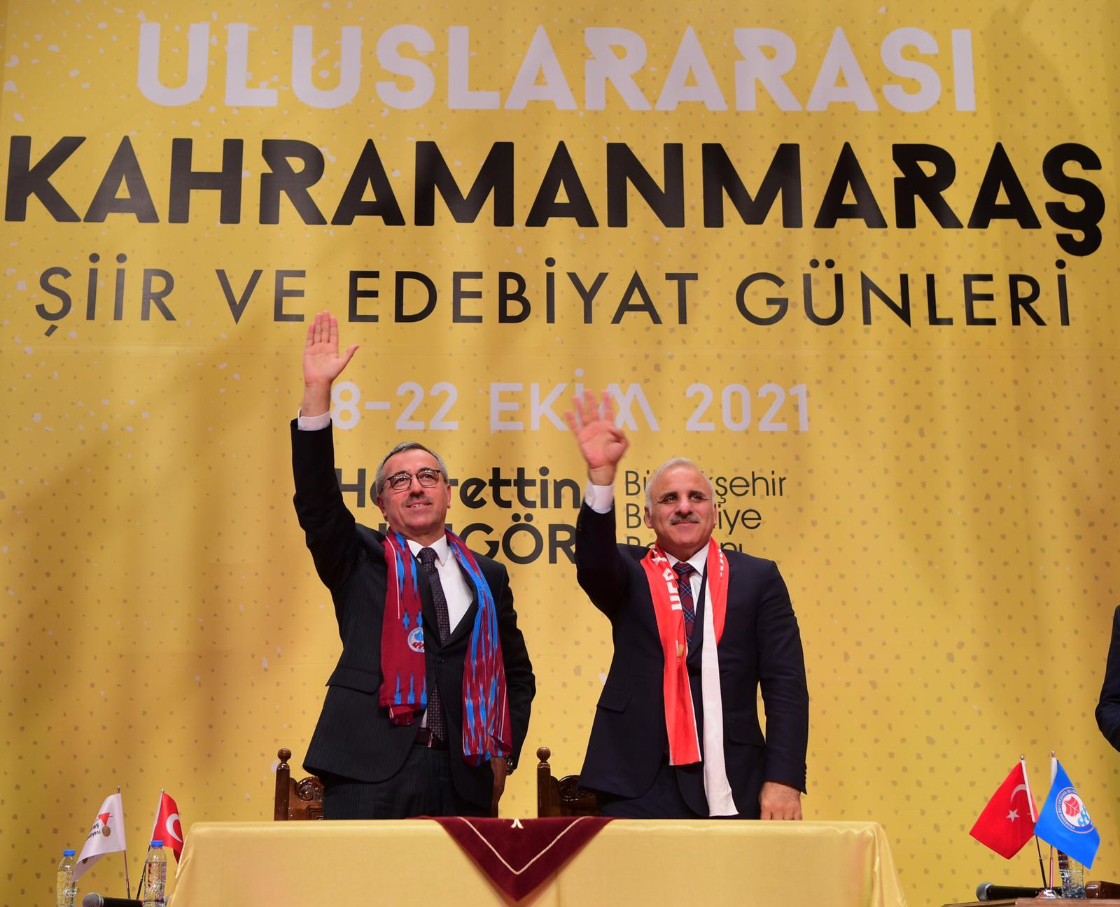 Kahramanmaraş Büyükşehir Belediyesi tarafından düzenlenen 2. Uluslararası Şiir ve Edebiyat Günleri tarihi bir etkinliğe ev sahipliği yaptı. Kahramanmaraş Büyükşehir Belediye Başkanı Hayrettin Güngör ve Trabzon Büyükşehir Belediye Başkanı Murat Zorluoğlu, İki Kardeş Şehrin Hikayesi: Kahramanmaraş ve Trabzon Buluşması’nda bir araya geldi. Trabzon’dan çok sayıda misafirin yer aldığı etkinliğe, Vali Ömer Faruk Coşkun, AK Parti İl Başkanı Fırat Görgel, ilçe belediye başkanları, protokol üyeleri ve vatandaşlar katıldı. Kahramanmaraş Büyükşehir Belediyesi halk oyunları ekibinin performanslarıyla başlayan etkinlik, Trabzonlu Sanatçı Adem Ekiz’in kemençesi eşliğinde söylediği Karadeniz’le özdeşleşen “Divane Aşık Gibi” parçasıyla devam etti. Âşık Mahzuni Şerif Ses Yarışması birincisi Hatice Gökçeli ise, “Boşumuş” türküsünü seslendirdi.