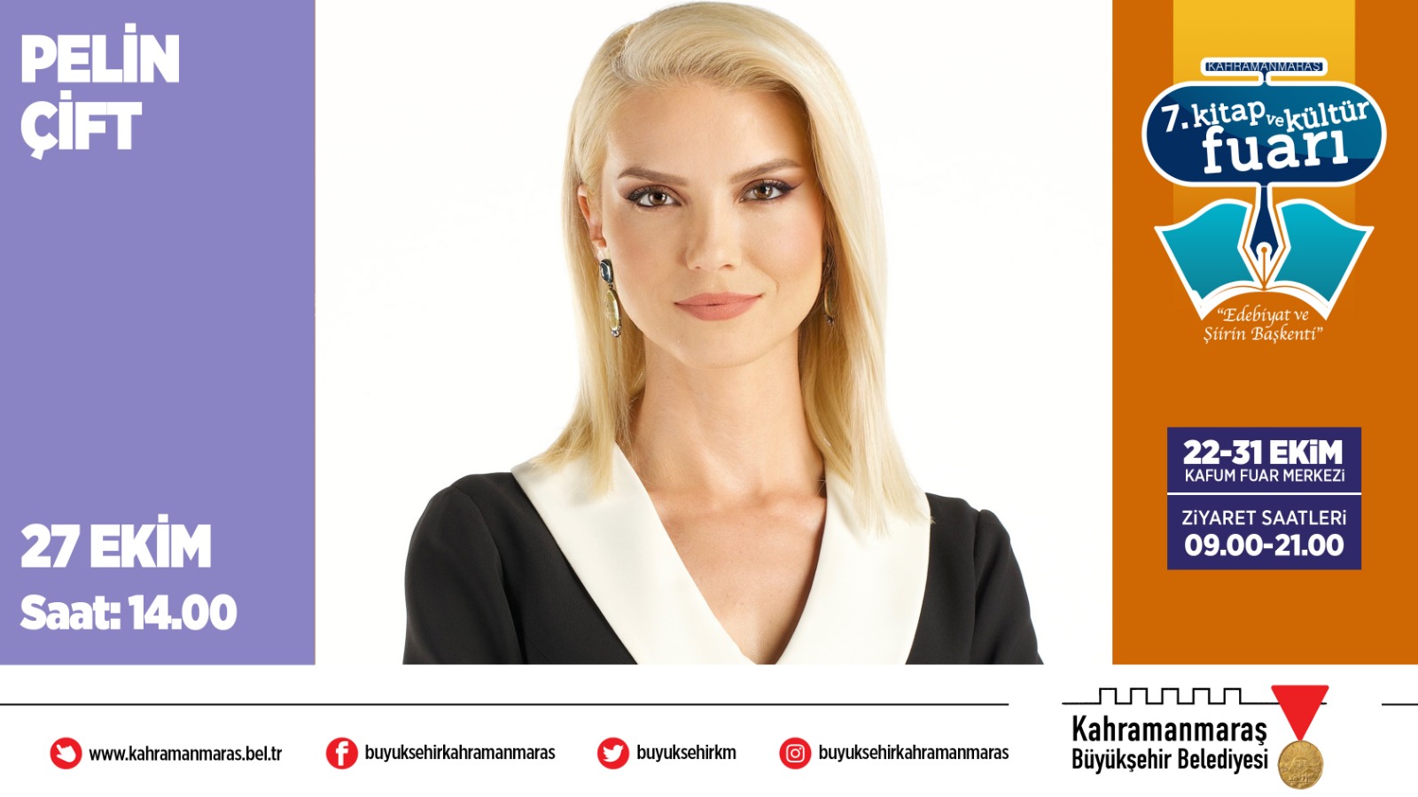 Büyükşehir Belediyesi tarafından düzenlenen 7. Uluslararası Kitap ve Kültür Fuarı’nda 27 Ekim Çarşamba günü Melih Tuğtağ, Pelin Çift ve Prof. Dr. Tufan Gündüz imza günü ve söyleşilerle edebiyatseverlerle buluşacak.