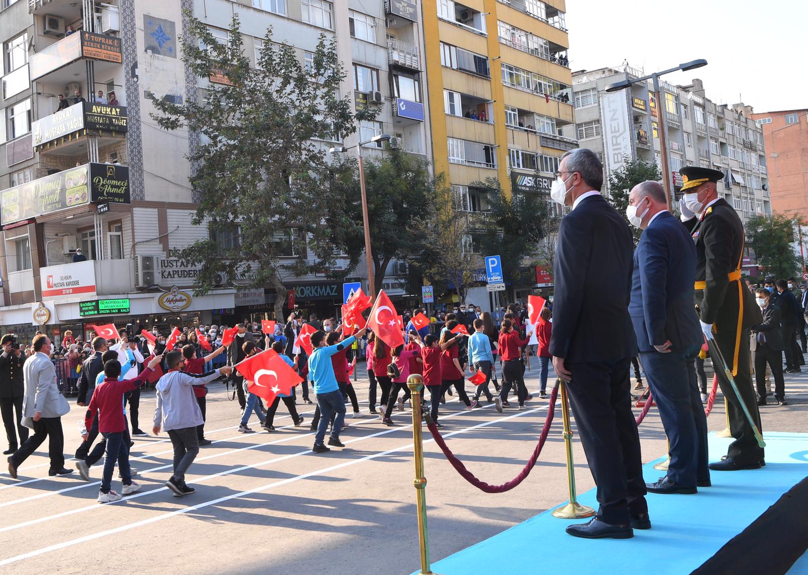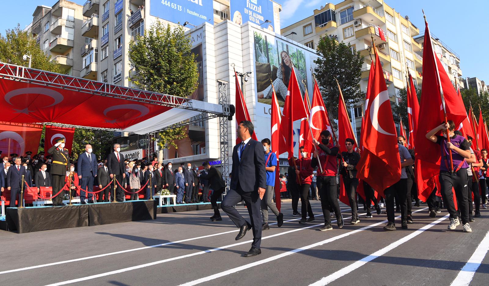 Büyükşehir Belediye Başkanı Hayrettin Güngör, “Cumhuriyetimizin 98. Yılını kahraman şehrimizde büyük bir coşkuyla kutladık. Ülkemiz hamdolsun güçlü adımlarla huzur ve refah dolu yarınlara yürüyor. Gazi Mustafa Kemal Atatürk başta olmak üzere tüm kahraman ecdadımızı rahmet ve minnetle anıyorum. Cumhuriyet Bayramımız kutlu olsun” dedi. Öğrencilerin şiirler okumasının ardından Suzan ve Abdulhakim Bilgili Halk Eğitim Merkezi’nin halk oyunları gösterisinin yapıldığı program, öğrenciler, izciler, halk oyunları ekibi, gaziler ve askeri birliklerin geçit töreni ile sona erdi.