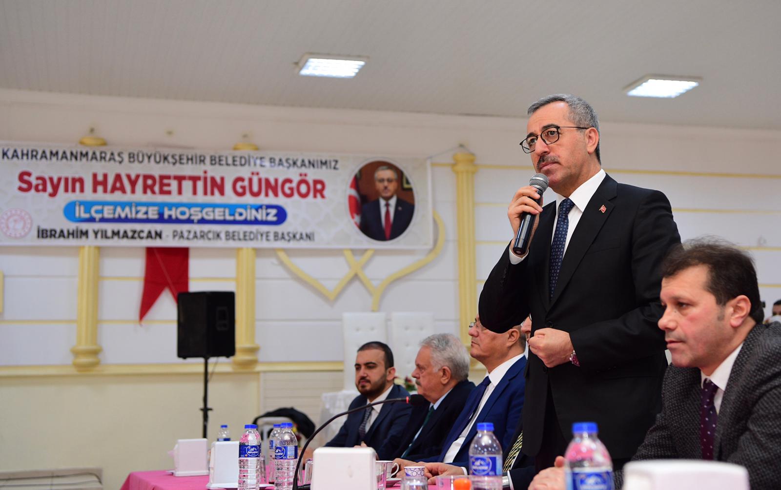 Büyükşehir Belediye Başkanı Hayrettin Güngör konuşmasını, “Önümüzdeki yıl şehrimizde 1 Milyar 250 Milyon TL yatırım hedefliyoruz. Pazarcık’ı seviyoruz, Kahramanmaraş’ımızı seviyoruz, Türkiye’mizi seviyoruz. Bu ilçemiz kardeşliği ile birliği ile örnek bir ilçemiz. Sizlerle gurur duyuyorum. Biz Cumhurbaşkanımızın Recep Tayyip Erdoğan'ın liderliğinde ve partimizin gelenekleri çerçevesinde hizmet etmeye devam edeceğiz. Bizim sözümüz; işimizdir, yaptıklarımızdır” ifadeleriyle tamamladı. Ziyaret programı ise AK Parti İlçe Başkanlığı, Pazarcık Belediyesi ve kaymakamlık ziyaretleriyle noktalandı.
