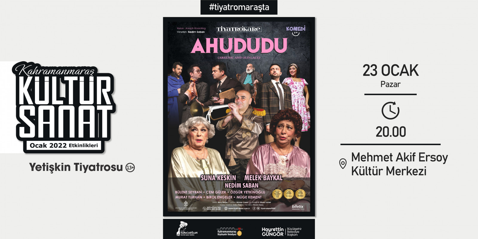 Kahramanmaraş Büyükşehir Belediyesi tarafından geleneksel hale getirilen “Kültür Sanat Sezonu” etkinlikleri Ocak ayında da devam ediyor. 2 – 30 Ocak tarihleri arasında sergiden konserlere, söyleşilerden tiyatrolara kadar toplam 17 etkinlik edebiyatın başkenti Kahramanmaraş’ta sanatseverlerle buluşacak. Takvim kapsamında; Haadi Mousavi ve Şahin Aslan’ın objektifinden çıkan “Elimin Emeği” adlı sergi ziyaretçilerine kapılarını açarken, “Çırpınırdı Karadeniz” eserinin güçlü sesi Azerin konseri kulakların pasını silecek. Minik izleyicileri de etkinliklerde özel bir hafta bekliyor; 5 gün boyunca birbirinden eğlenceli 5 tiyatro gösterisi “Çocuk Festivali” kapsamında sahne alacak. Ocak Kültür Sanat Sezonu etkinlik takvimine https://kahramanmaras.bel.tr/duyuru/2021/11/01/ocak-ayi-kultur-sanat-sezonu-etkinlik-takvimi adresinden ulaşılabiliyor.