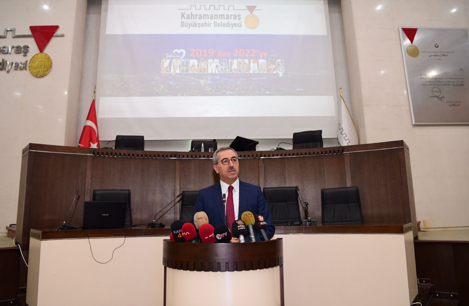 Kahramanmaraş Büyükşehir Belediye Başkanı Hayrettin Güngör, basın mensuplarıyla bir araya geldi. Meclis Toplantı Salonu’nda gerçekleştirilen buluşmada Başkan Hayrettin Güngör 2019’dan 2022’ye başlıklı bir sunum gerçekleştirdi. Hayrettin Güngör yaptığı konuşmada, “Biz göreve geldiğimizde mali yapımızı disipline ederek, ağırlıkla dağınık yerleşim alanlarına sahip olan Kahramanmaraş’ımızda öncelik olarak belirlediğimiz yol ve su ihtiyacını süratle karşılamaya çalıştık. Bir yandan da yerel kalkınma odaklı yaptığımız projelerle şehrimizin her türlü potansiyeline katma değer kazandırarak, sahip olduğumuz doğal, yerel, kültürel miraslarımızı markalaştırmak için eylem planları yaptık. Hamdolsun çalışmalarımızda ciddi bir mesafe kat ettik” diye konuştu.