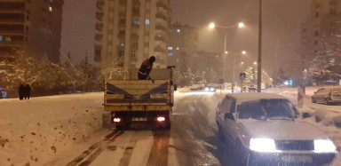 Büyükşehir Belediyesi, akşam saatlerinden itibaren kesintisiz şekilde devam eden kar yağışıyla mücadele çalışmalarını aralıksız sürdürüyor. Ana arterleri açan ekipler bir yandan da tuzlama çalışmaları gerçekleştiriyor.