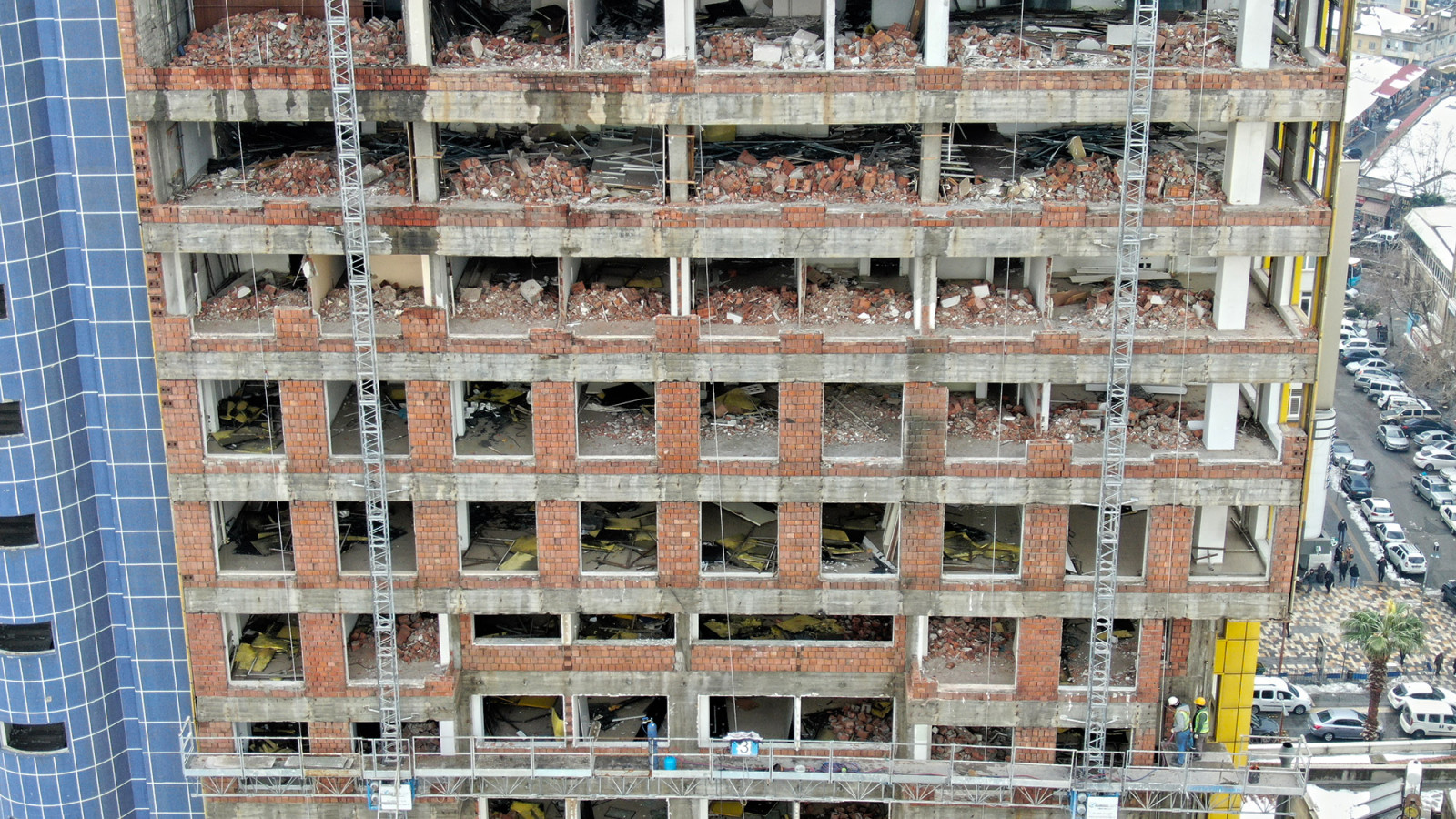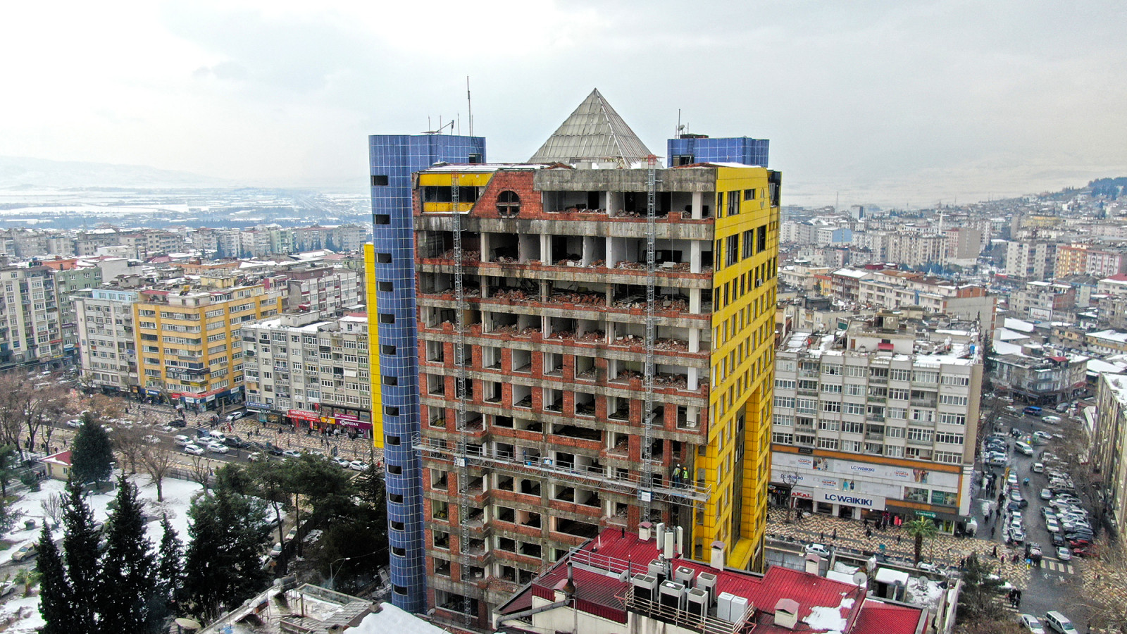 Kahramanmaraş Büyükşehir Belediyesi’nin şehir merkezinde, Trabzon Caddesi üzerinde başlattığı dönüşüm çalışması tüm hızıyla devam ediyor. Valilik kampüsü içerisinde yer alan AFAD ve Eski Emniyet binalarının yıkım ve enkaz taşıma işlemlerinin tamamlanmasının ardından 18 katlı İl Özel İdare İş Merkezi’nde de yıkım hazırlık çalışmaları sürüyor. Yıkım ve enkaz satış ihalesi kapsamında Büyükşehir Belediyesi’ne 6.6 Milyon TL’lik ek kaynak sağlayacak proje kapsamında kurulan dev iskelelerle binanın cephe ve iç mekân uygulamalarının sökümü de devam ediyor.