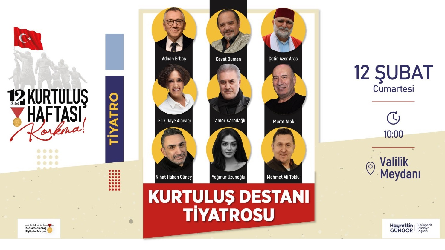 12 Şubat Kurtuluş Bayramı kutlama etkinliği ile ilgili olarak Büyükşehir Belediyesi tarafından yapılan açıklamada, “Kurtuluş Haftası etkinliklerinde 12 Şubat Cumartesi günü bayram coşkusu yaşanacak. 12 Şubat Cumartesi günü Valilik Meydanı’nda film gösterimlerinin yanı sıra aralarında Tamer Karadağlı’nın da yer aldığı devlet tiyatrosu sanatçıları tarafından ‘Kurtuluş Destanı’ isimli oyun sahnelenecek. Çeşitli halk oyunları gösterileri ve yürüyüş kortejinin yapılacağı programlara tüm vatandaşlarımız davetlidir” ifadelerine yer verildi.