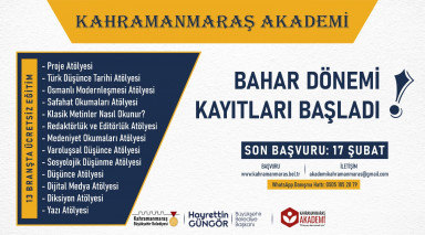 Kahramanmaraş Büyükşehir Belediyesi tarafından düzenlenen Kahramanmaraş Akademi de 2022 Bahar Dönemi başvuruları başladı. Alanında uzman eğitmenler tarafından kursiyerlere verilecek eğitimler arasında Proje Atölyesi, Türk Düşünce Tarihi Atölyesi, Osmanlı Modernleşmesi Atölyesi, Safahat Okumaları Atölyesi, Klasik Metinler Nasıl Okunur? Editörlük ve Redaktörlük Atölyesi, Medeniyet Okumaları Atölyesi, Varoluşsal Düşünce Atölyesi, Sosyolojik Düşünme Atölyesi, Düşünce Atölyesi, Dijital Medya Atölyesi, Diksiyon Atölyesi ve Yazı Atölyesi yer alıyor. Başvurular 11 – 17 Şubat tarihleri Büyükşehir Belediyesi’nin internet sitesi üzerinden (https://kahramanmaras.bel.tr) yapılabilecek. Yedi Güzel Adam Edebiyat Müzesi’nde verilecek olan eğitimler 19 Şubat - 23 Nisan tarihlerinde gerçekleştirilecek. Yapılan açıklamada eğitimler ve başvurular için bilgi almak isteyen kursiyerlerin 0505 185 20 79 whatsapp Danışma Hattı üzerinden ilgili birimlere ulaşılabileceği belirtildi.