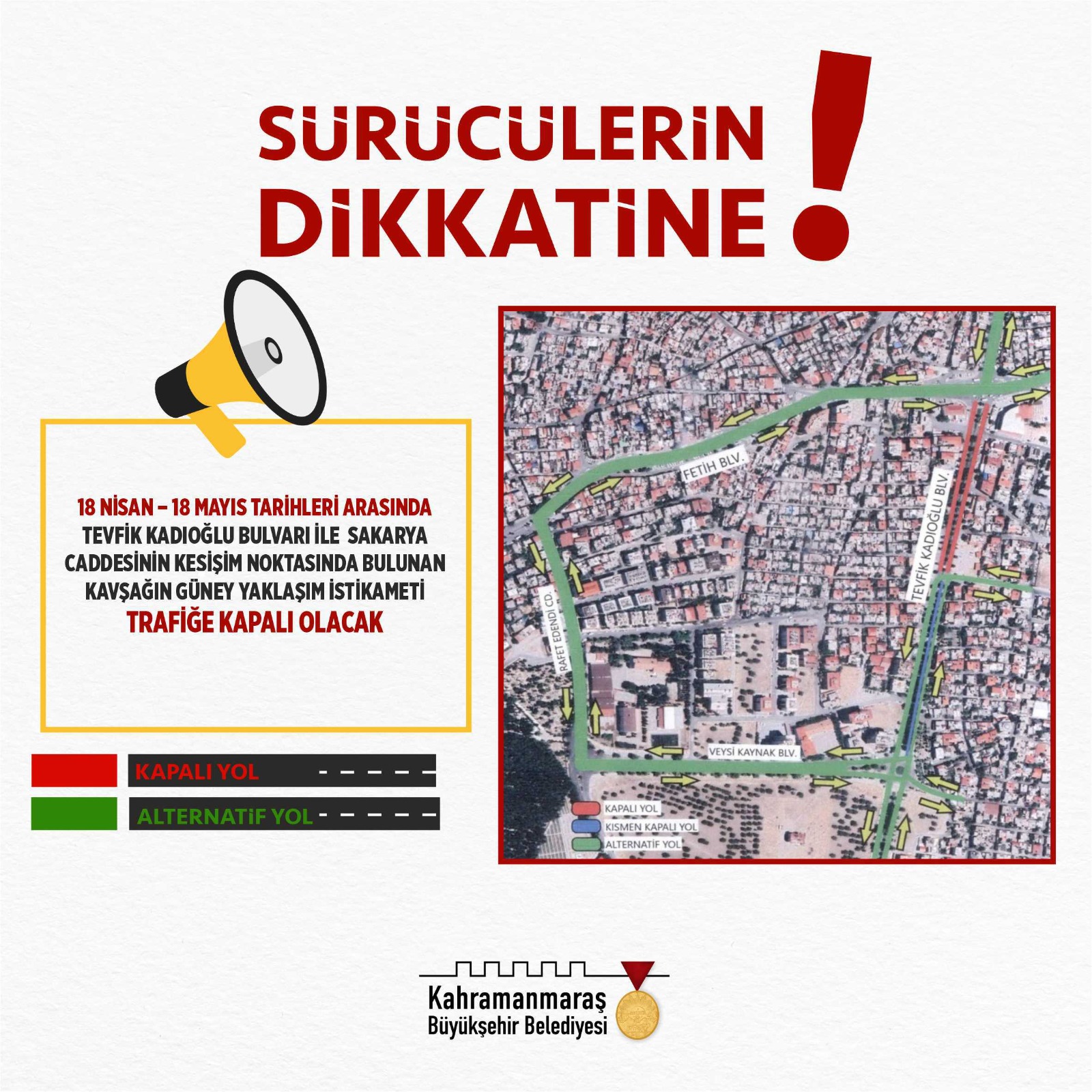 Tevfik Kadıoğlu Bulvarı Alt Geçit projesinde çalışmalar start alıyor. Bu kapsamda, alınan UKOME kararları doğrultusunda Tevfik Kadıoğlu Bulvarı ile Sakarya Caddesinin kesişim noktasında bulunan kavşağın güney yaklaşım istikametinin 18 Nisan – 18 Mayıs tarihleri arasında trafiğe kapalı olacağı belirtildi.