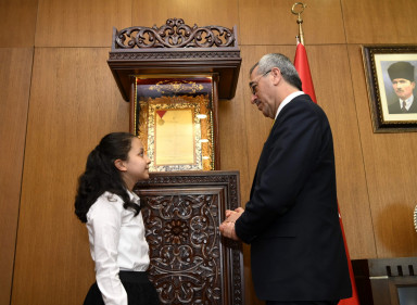Kahramanmaraş Büyükşehir Belediye Başkanı Hayrettin Güngör, 23 Nisan Ulusal Egemenlik ve Çocuk Bayramı dolayısıyla Türk Telekom Ortaokulu Müdür Yardımcısı Ferhat Bal, Türkçe öğretmeni Ahmet Savtekin Samur, 5. sınıf öğrencisi Hazal Sakallı ve babası Ataman Sakallı’yı makamında ağırladı. Başkan Güngör, ziyarette Ulusal Egemenlik ve Çocuk Bayramı dolayısıyla makam koltuğunu 5. sınıf öğrencisi Hazal Sakallı’ya devretti. Misafirlerle yakından ilgilenen Başkan Güngör, “Öncelikle bütün çocuklarımızın 23 Nisan Ulusal Egemenlik ve Çocuk Bayramı’nı tebrik ediyorum. Bugün de Hazal Başkanımızı misafir ettik. Gerçekten başkanlığa hemen adapte oldu. Büyükşehir Belediyesi birimlerimizle irtibata geçti, eğitimle ilgili talimatlar verdi. Bu anlamlı günde bizlere eşlik ettiği için kendisine teşekkür ediyorum” dedi.