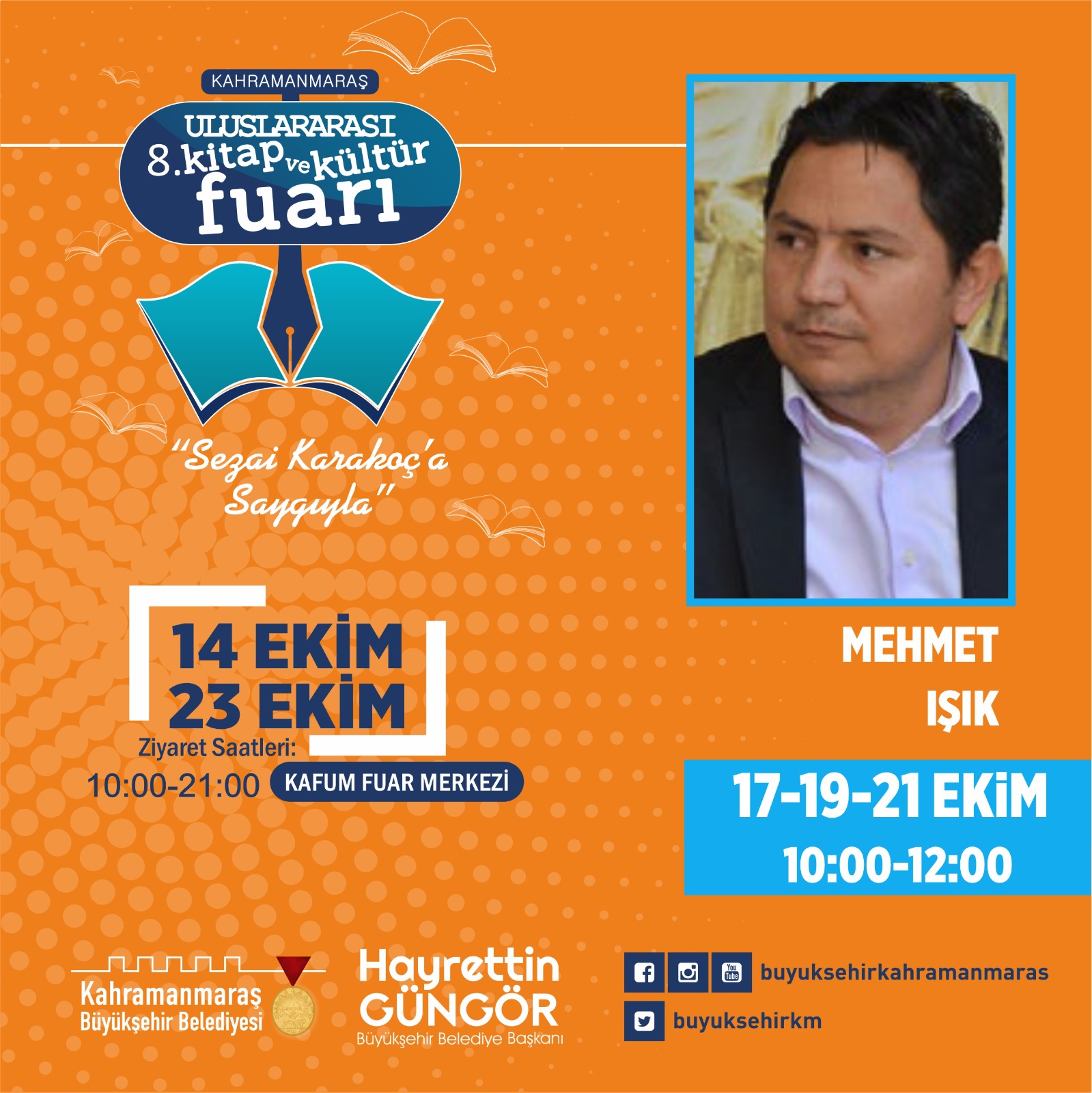 Kahramanmaraş 8. Uluslararası Kitap ve Kültür Fuarı’nda 17 Ekim Pazartesi günü usta kalemler ve alanında uzman isimler edebiyatseverlerle buluşacak. Fuarda saat 14.00’da Büyükşehir Belediye Başkanı Hayrettin Güngör de kültür sanat dostlarıyla bir araya gelecek.