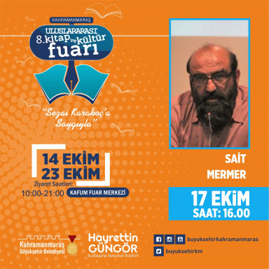 Kahramanmaraş 8. Uluslarası Kitap ve Kültür Fuarı, yüzlerce yayınevi ve yazar ile binlerce kitabı edebiyatseverlerle buluşturmaya devam ediyor. İmza günü, söyleşi ve panel gibi çeşitli etkinliklerin düzenlendiği fuarda; 17 Ekim Pazartesi günü saat 10.00’da Tarihçi - Yazar Mehmet Işık, saat 13.00’da Şair - Yazar Bestami Yazgan, saat 16.00’da Yazar Sait Mermer ve saat 17.00’da Gazeteci - Yazar Yusuf Kaplan söyleşi ve imza günü etkinliklerinde kültür sanat dostlarıyla buluşacak. Saat 19.00’da gerçekleştirilecek etkinlikte ise ebediyete göç etmiş Kahramanmaraşlı usta şair Bahaeddin Karakoç’u anma programı düzenlenecek.
