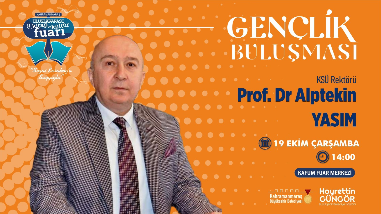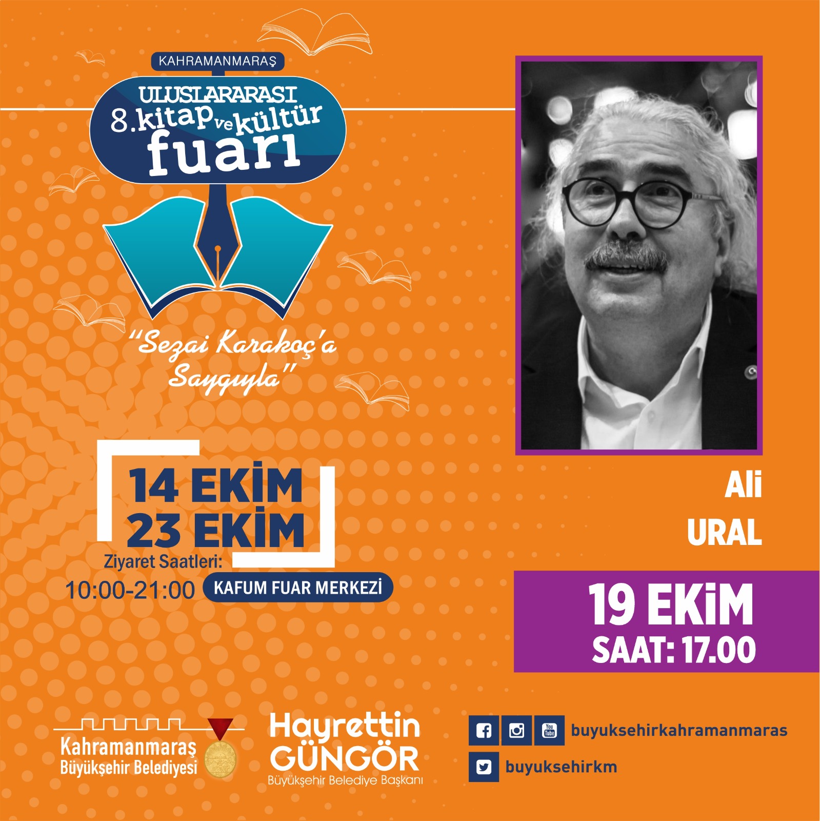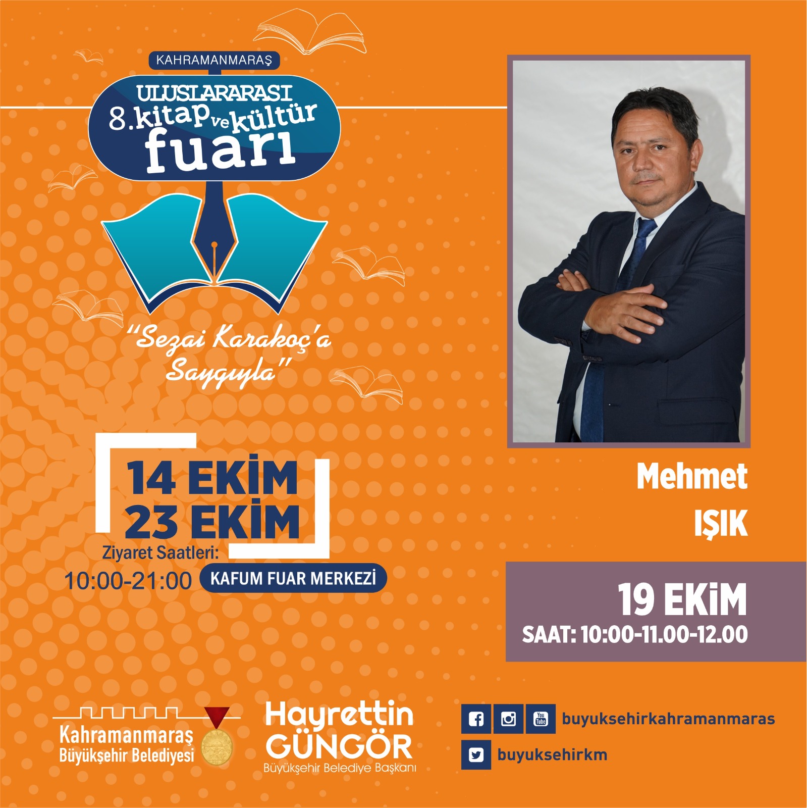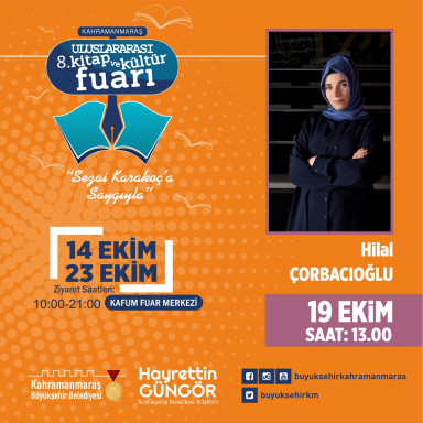 Büyükşehir Belediyesi’nin düzenlediği Kahramanmaraş 8. Uluslararası Kitap ve Kültür Fuarı’nda 19 Ekim Çarşamba günü Mehmet Işık, Hilal Çorbacıoğlu, KSÜ Rektörü Prof. Dr. Alptekin Yasım, Hulki Cevizoğlu ve Ali Ural, edebiyatseverlerle bir araya gelecek.