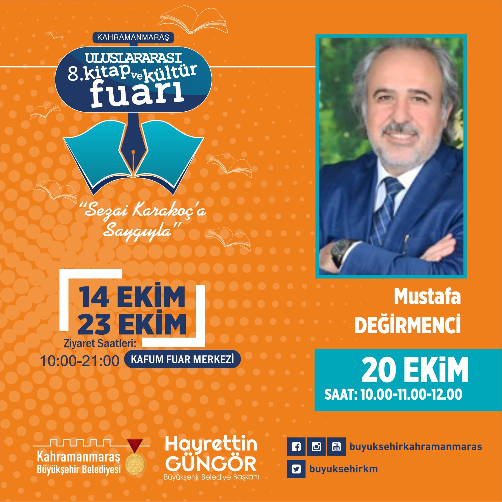 Kahramanmaraş Büyükşehir Belediyesi tarafından düzenlenen 8. Uluslararası Kitap ve Kültür Fuarı 20 Ekim Perşembe günü imza günü, söyleşi ve panel etkinlikleriyle hız kesmeden devam edecek. Etkinlikler saat 10.00 – 11.00 ve 12.00’da gerçekleştirilecek Mustafa Değirmenci söyleşisiyle start alacak. Ardından saat 13.00’da Yazar Tuğba Coşkuner, 17.00’da Prof. Dr. Uğur Batı, 18.00’da ise Yazar Turan Karataş okurlarla bir araya gelecek.