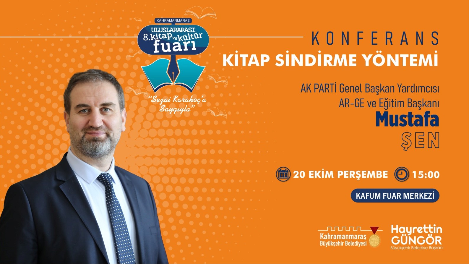 Büyükşehir Belediyesi tarafından düzenlenen 8. Uluslararası Kitap ve Kültür Fuarı’nda 20 Ekim Perşembe günü usta kalemler ve alanında uzman isimlerin yanı sıra AK Parti Genel Başkan Yardımcısı Mustafa Şen ve MKYK Üyesi Burhan Sakallı Kahramanmaraşlılarla bir araya gelecek.
