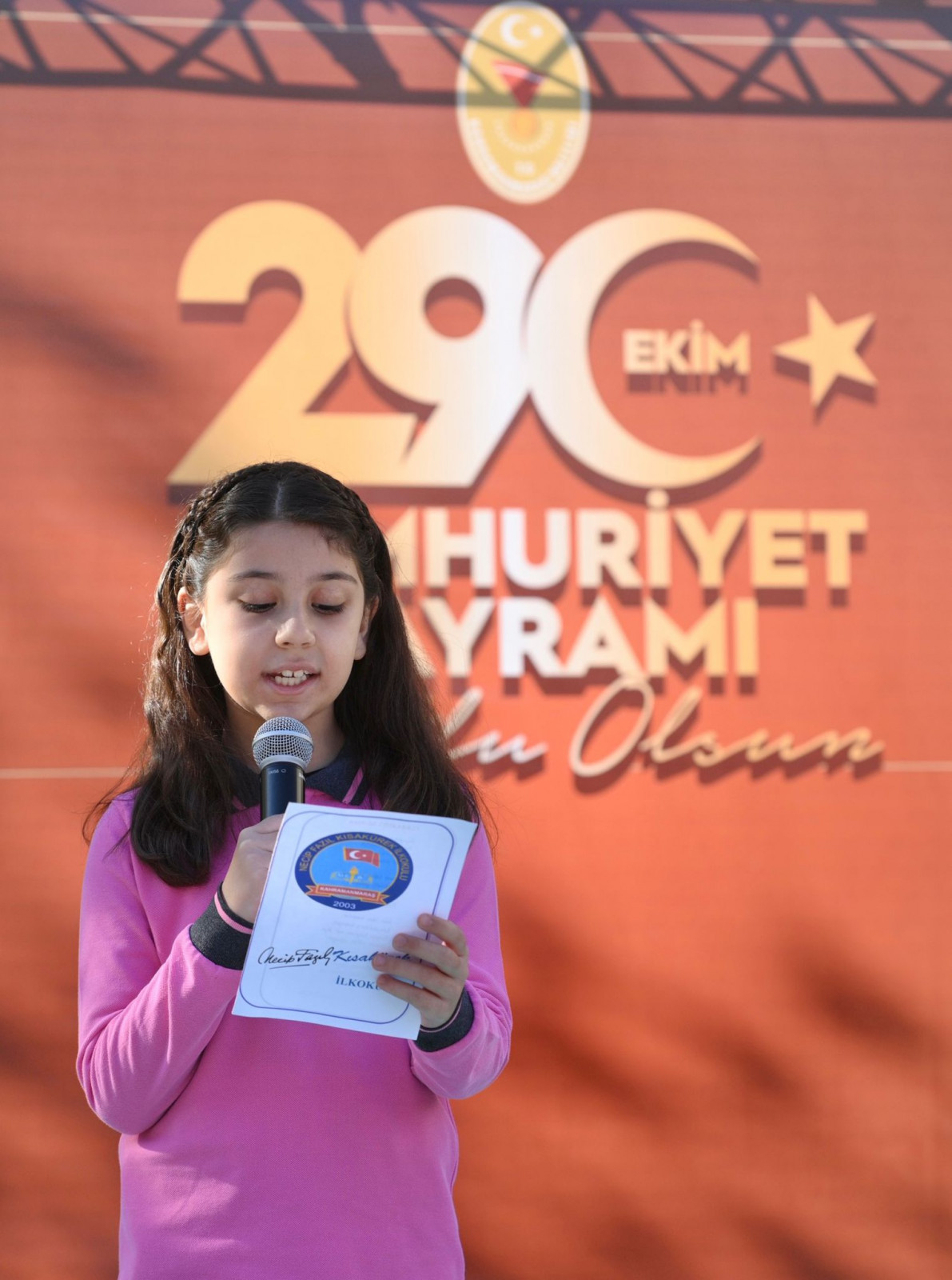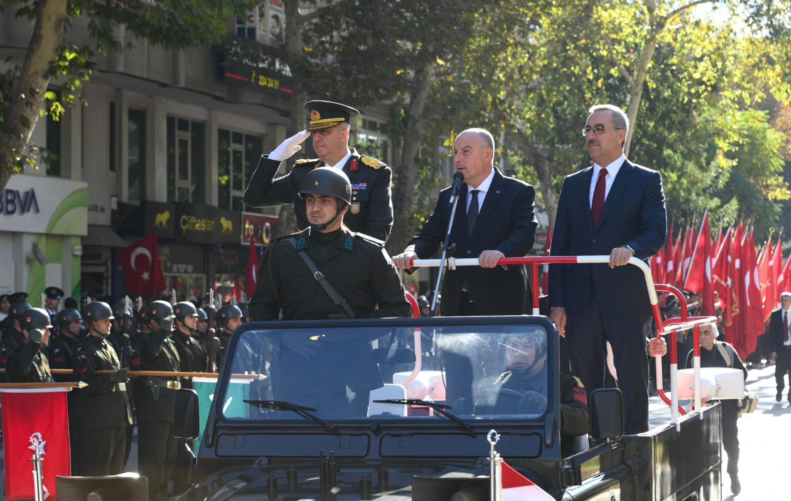 Valilik Meydanı’nda gerçekleştirilen törende günün anlam ve önemine ilişkin konuşma yapan Vali Ömer Faruk Coşkun, “Bugün, Cumhuriyetimizin kuruluşunun 99. yıl dönümünü büyük bir coşku ve gururla hep birlikte kutluyoruz. Cumhuriyet, aziz milletimizin Gazi Mustafa Kemal Atatürk önderliğinde verdiği emsalsiz mücadelenin, onurlu duruşun, vatan sevgisinin, egemenliğine sahip çıkma ve bağımsız yaşama iradesinin ortaya çıkardığı bir eserdir. Kurtuluş Savaşı’nı zaferle sonuçlandıran kahraman ecdadımız, geçmişimize gururla, geleceğimize güvenle bakmamızı sağlayacak bu ülkeyi bizlere armağan etmiştir. Cumhuriyetimizin kurulduğu 29 Ekim 1923 yılından itibaren geçen 99 yılda Türkiye Cumhuriyeti, büyüyen ekonomisi, sağlık, eğitim, bilim ve kültür alanındaki atılımları ve demokrasisiyle, dünyanın yükselen güçlü ülkeleri arasındaki yerini almış, önemli mesafeler kat etmiştir. Bizler de aynı ruhla cennet vatanımıza ve Cumhuriyetimize sahip çıkacak, gelecek kuşaklara her alanda gurur duyacakları bir ülke bırakmak için gayret edeceğiz” ifadelerini kullandı.