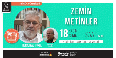 Etkinlik takvimi kapsamında, 18 Kasım Cuma günü Yazar Dursun Ali Tökel’in katılımıyla Yitiksöz Söyleşileri gerçekleştirilecek. Yedi Güzel Adam Edebiyat Müzesi’nde düzenlenecek söyleşi, saat 19.00’da başlayacak. Edebi metinlerin ve Türk Edebiyatı’nın konuşulacağı etkinliğe tüm edebiyatseverler davet edildi.