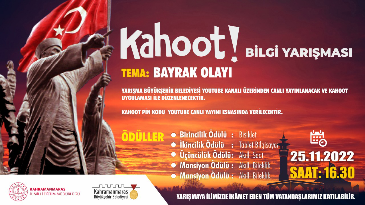 Büyükşehir Belediyesi ve İl Milli Eğitim Müdürlüğü iş birliğiyle 25 Kasım Cuma günü ‘Bayrak Olayı’ temalı Kahoot Bilgi Yarışması düzenlenecek. Kahramanmaraş’ta ikamet eden herkesin katılabileceği yarışmada dereceye girenler çeşitli ödüller de kazanabilecek.
