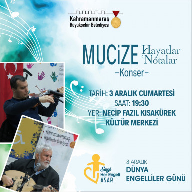 Sosyal belediyecilik hizmetleri çerçevesinde her zaman özel gereksinimli bireylerin yanında olan, desteklerini hiçbir zaman eksik etmeyen Kahramanmaraş Büyükşehir Belediyesi, 3 Aralık Dünya Engelliler Günü’nde ‘Mucize Hayatlar – Notalar’ temalı konser etkinliği düzenleyecek. Sevgi Her Engeli Aşar mottosuyla 3 Aralık Cumartesi günü Necip Fazıl Kısakürek Kültür Merkezi’nde düzenlenecek konser, saat 19.30’da başlayacak. Büyükşehir Belediyesi’nden yapılan açıklamada, başta özel gereksinimli bireyler olmak üzere konsere tüm Kahramanmaraşlıların davetli olduğu belirtildi.