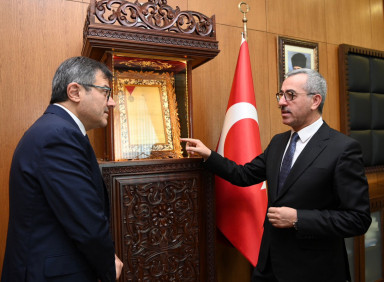 Kahramanmaraş Büyükşehir Belediye Başkanı Hayrettin Güngör, bir dizi programa katılmak için şehre gelen Cumhurbaşkanlığı Finans Ofisi Başkanı Prof. Dr. Göksel Aşan’ı makamında ağırladı. Kahramanmaraş’ın Milli Mücadelesi, şehrin sembolü olan İstiklal Madalyası, coğrafi işaretli ürünleri ve kültür sanat etkinlikleri hakkında Prof. Dr. Aşan’a bilgiler aktaran Başkan Hayrettin Güngör, Kahramanmaraş’a özgü çeşitli hediyeler de takdim etti. Ziyaretten duyduğu memnuniyeti belirterek Finans Ofisi Başkanı Prof. Dr. Göksel Aşan’a teşekkür eden Güngör, “Programı kapsamında Kahramanmaraş’ımıza gelen Cumhurbaşkanlığı Finans Ofisi Başkanımız Sayın Prof. Dr. Göksel Aşan’ı misafir ettik. Kahramanmaraş’ımızın tarihini, kültürünü, gastronomisini ve değerlerini konuştuk. Nazik ziyaretleri için Sayın Göksel Aşan’a teşekkür ediyorum” dedi.