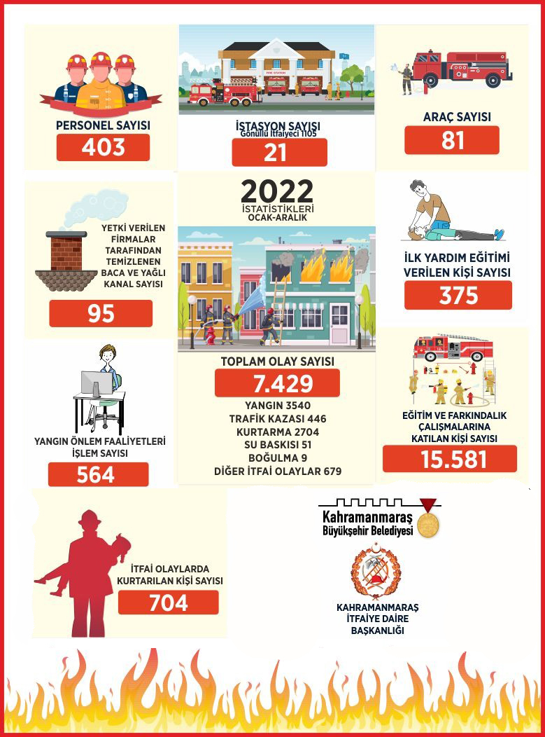 Verilere göre 2022 yılında Kahramanmaraş’ta her 2 buçuk saatte bir yangın meydana geldi. İtfaiye ekipleri; 540 konut, 170 iş yeri, 86 fabrika, 379 araç ve lastik, 71 orman, 2 bin 107 bağ-bahçe-anız, 21 kamu binası-ibadethane-park, 101 trafo ve elektrik direği, 65 akaryakıt ve doğalgaz kaynaklı yangın olmak üzere toplamda 3 bin 540 yangına hızlı ve etkin bir şekilde müdahale ederek olası can ve mal kayıplarının önüne geçti.