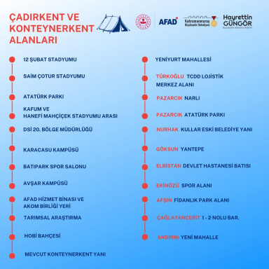 Büyükşehir Belediyesi’nden yapılan açıklamada şehirdeki toplanma alanları: 12 Şubat Stadyumu, Saim Çotur Stadyumu, Atatürk Parkı, KAFUM ile Hanefi Mahçiçek Stadı arası, Hanefi Mahçiçek Stadı, DSİ 20. Bölge Müdürlüğü, Karacasu Kampüsü, Batıpark Spor Salonu, Avşar Kampüsü, AFAD Hizmet Binası ve Arama Kurtarma Birliği yeri ve bitişiğindeki alan, Tarımsal Araştırma, Hobi Bahçesi, mevcut Konteynerkent yanı, Yeniyurt Mahallesi, Türkoğlu TCDD Lojistik Merkez Alanı, Pazarcık Narlı, Pazarcık Atatürk Parkı, Nurhak Kullar eski belediye yanı, Göksun Yantepe, Elbistan Devlet Hastanesi batısı, Ekinözü Spor alanı, Afşin Fidanlık park alanı, Çağlayancerit 1 ve 2 Nolu Bar. ve Andırın Yeni Mahallesi olarak belirtildi.