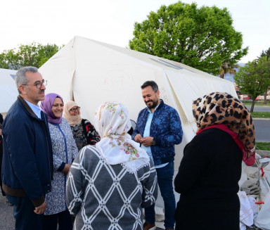 Eyüp Sultan Mahallesi’nde kurulan geçici konaklama merkezinde vatandaşlarla bir araya gelen Başkan Güngör, “Çok zor bir süreçten geçiyoruz ancak devlet millet el birliğiyle yaralarımızı sarıyor ve şehrimizi hızla yeniden imar etmeye çalışıyoruz” dedi.