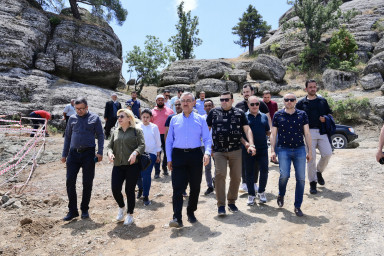 Ali Kayası Cam Teras ve Turizm Tesisleri projesinde incelemelerde bulunan Başkan Güngör, “Büyükşehir Belediyesi olarak şehrimizin doğa turizmine hizmet edecek Ali Kayası’nda başlattığımız Cam Teras ve Turizm Tesisleri projemiz devam ediyor. Deprem sonrası projemize tekrar başladık” dedi.