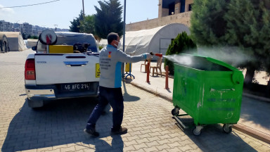 Kahramanmaraş Büyükşehir Belediyesi, meydana gelebilecek olası salgın hastalıkların önüne geçerek halk sağlığını korumak için şehir genelinde temizlik, ilaçlama, dezenfeksiyon ve zararlılarla mücadele çalışmalarını kesintisiz sürdürüyor. Çevre Koruma ve Kontrol Dairesi Başkanlığı’nca 54 araç ve 110 personelle yürütülen çalışmalarla, geçici konaklama merkezleri başta olmak üzere ortak kullanım alanları dezenfekte edilirken bitkiler de haşerelere karşı ilaçlanıyor. Rutin olarak sürdürülen çalışmalarla, ortak kullanım alanlarının dezenfeksiyonu gerçekleştirilirken, zararlıların popülasyonlarındaki artışların da önüne geçilerek halk sağlığının korunması sağlanıyor. Çevre Koruma ve Kontrol Dairesi Başkanlığı’ndan yapılan açıklamada, şehir genelinde temizlik, ilaçlama ve dezenfeksiyon çalışmalarının artarak devam ettiği belirtildi.