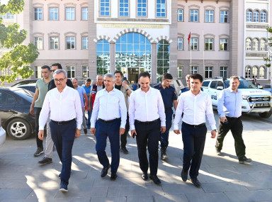 Vali Mükerrem Ünlüer ile Türkoğlu’nda bir dizi ziyaret gerçekleştiren Büyükşehir Belediye Başkanı Hayrettin Güngör, köy evleri ve inşası devam eden kalıcı konutları da yerinde inceledi.