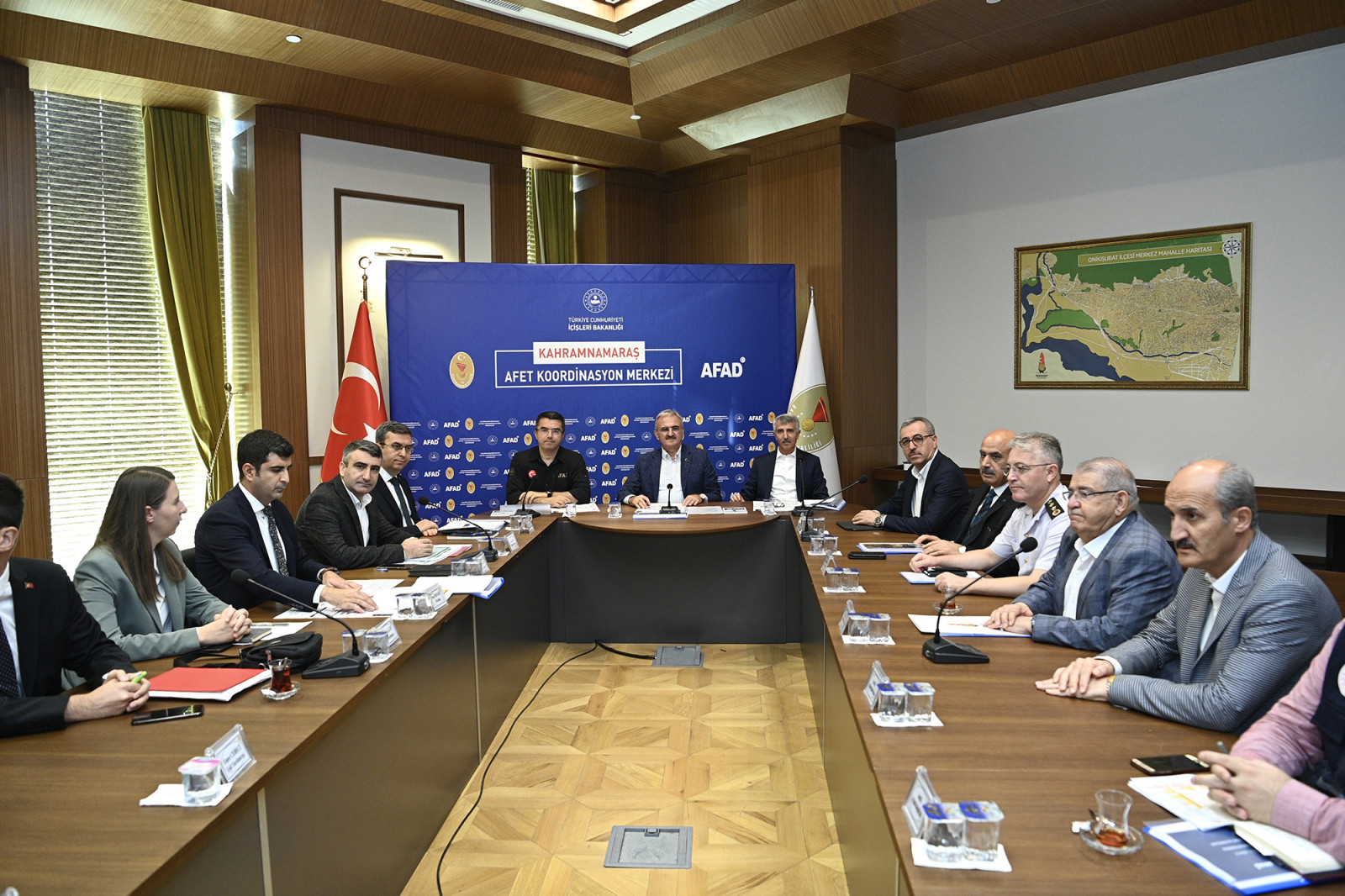 Kahramanmaraş Büyükşehir Belediye Başkanı Hayrettin Güngör, şehrin imar ve inşası noktasında alanda yürütülen çalışmaları yerinde incelemek üzere Kahramanmaraş’a gelen İçişleri Bakan Yardımcısı Münir Karaloğlu ve AFAD Başkanı Okay Memiş ile Afet Koordinasyon Merkezi’nde gerçekleştirilen istişare ve değerlendirme toplantısına katıldı. Vali Mükerrem Ünlüer, Dulkadiroğlu Kaymakamı Dr. Fatih Çelikkaya, Onikişubat Kaymakamı Serkan Keçeli, İl Jandarma Komutanı Albay Tolga Yağan, İl Emniyet Müdürü Nurettin Gökduman, Dulkadiroğlu Belediye Başkanı Necati Okay, Onikişubat Belediye Başkanı Hanefi Mahçiçek ve kurum yetkililerinin de yer aldığı toplantıda, şehirde son duruma ilişkin değerlendirmelerde bulunuldu.