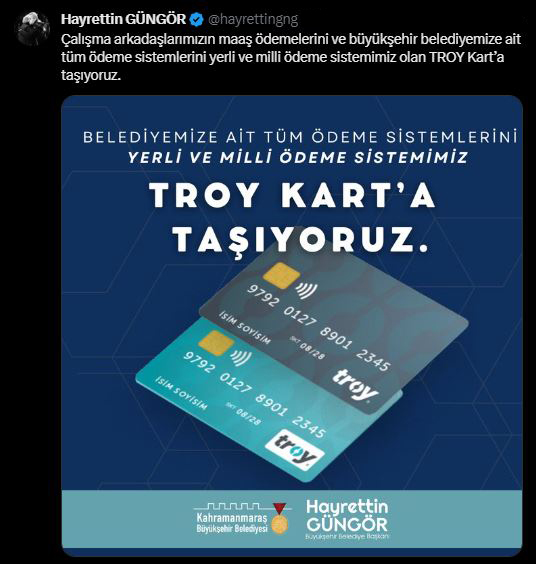 Geçtiğimiz hafta alınan kararla Büyükşehir Belediyesine ait tesislerde İsrail destekçisi ürünlerin satış ve dağıtımını yasaklayan Kahramanmaraş Büyükşehir Belediyesi, şimdi de ödeme sistemlerinde yerli ve milli TROY Kart’a geçileceğini duyurdu.