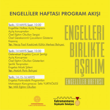 Başkan Fırat Görgel öncülüğünde sosyal belediyecilik çerçevesinde hayata geçirdiği faaliyetlerle vatandaşların takdirini kazanan, daima özel gereksinimli vatandaşların yanında olan ve sosyal hayata katılmaları noktasında çeşitli projeler üreten, daha erişilebilir bir Kahramanmaraş için gayretini sürdüren Kahramanmaraş Büyükşehir Belediyesi, 10 – 16 Mayıs Engelliler Haftası’nda da özel gereksinimli vatandaşlar için çeşitli programlar gerçekleştirecek. “Engelli Birey Yoktur, Yoluna Çıkan Engeller Vardır” mottosuyla düzenlenecek farkındalık programları, 10 Mayıs Cuma günü Necip Fazıl Kısakürek Kültür Merkezi’nde gerçekleştirilecek etkinliklerle başlayacak. Saat 10.00’da başlayacak programda, resim sergisi ve çocuk gösterileri vatandaşlarla buluşacak. 14 Mayıs Salı günü ise Atatürk Parkı’nda “Geleneksel Engelsiz Çocuk Şenliği” düzenlenecek. Saat 10.00’da başlayacak şenliğe tüm özel gereksinimli vatandaşlar ve aileleri davet edildi. Farkındalık programı kapsamında; bedensel engelli milli yüzücü Sefa Yurtkölesi, 14, 15 ve 16 Mayıs tarihlerinde şehir merkezindeki okulları ziyaret ederek engelsiz toplum, engellerle başa çıkmanın yolları ve özel gereksinimli vatandaşların sosyal hayata entegrasyonu gibi pek çok konuya değinecek.