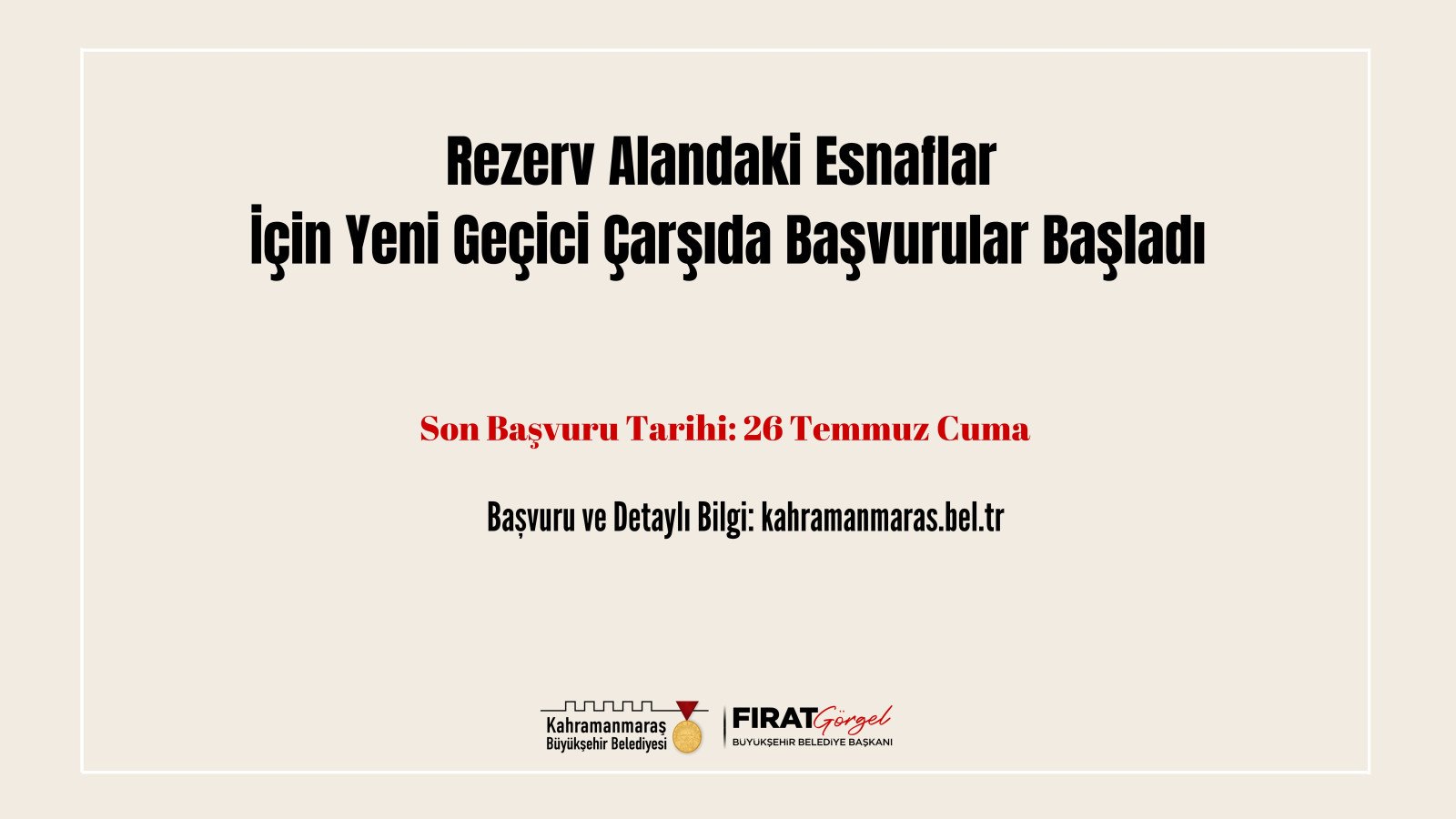 Yeni Kahramanmaraş’ın imar ve inşası noktasında paydaş kurumlarla birlikte tüm alanlarda çalışmalarını hummalı bir şekilde sürdüren Kahramanmaraş Büyükşehir Belediyesi, geçici çarşıların koordinesine de devam ediyor. Bu kapsamda Çevre, Şehircilik ve İklim Değişikliği Bakanlığı tarafından rezerv alan ilan edilen bölgede 6 Şubat depremleri öncesi faaliyetlerini sürdüren esnaflar ile deprem sonrası aynı alan içerisinde kurulan “Belediye Karşısı”, “Sakarya Ahşap” ve “Samsun” çarşılarında iş yeri olan esnaflar için Piazza AVM yanında yeni geçici çarşı oluşturuluyor. Oluşturulacak yeni geçici çarşıda iş yeri sahibi olmak isteyen esnaflar için başvurular başladı. Büyükşehir Belediyesi ana hizmet binasında bulunan Ticaret ve Sanayi Dönüşüm Ofisi’nden şahsen veya https://kahramanmaras.bel.tr/duyuru/2024/07/19/gecici-is-yeri-basvuru-ilani internet adresinden çevrimiçi yapılabilen başvurularda son gün 26 Temmuz Cuma. Başvuru şartlarına ve detaylı bilgiye Büyükşehir Belediyesinin internet adresinde duyurular bölümünden ulaşılabiliyor.