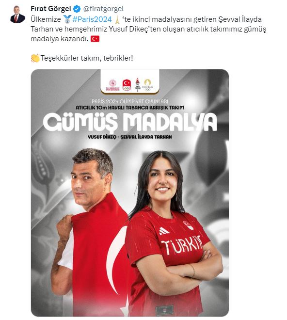 Paris 2024 Olimpiyat Oyunları’na Türkiye adına katılan Kahramanmaraşlı 5 sporcudan biri olan Yusuf Dikeç, 10 metre havalı tabanca karışık kategorisinde takım arkadaşı Şevval İlayda Tarhan ile gümüş madalya kazandı. Başkan Görgel, “Hemşehrimiz Yusuf Dikeç ve Şevval İlayda Tarhan’ı tebrik ediyor, başarılarının devamını diliyorum” dedi.