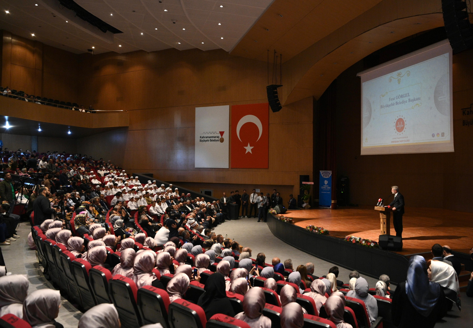 Kahramanmaraş Büyükşehir Belediye Başkanı Fırat Görgel, bir dizi ziyarette bulunmak ve programa katılmak üzere Kahramanmaraş’a gelen Diyanet İşleri Başkanı Prof. Dr. Ali Erbaş ile Kur’an’ı Anlama ve İslami İlimler Mezuniyet Töreni’ne katıldı. Mehmet Akif Ersoy Kültür Merkezi’nde gerçekleştirilen programda; Vali Mükerrem Ünlüer, Dünya Müslüman Âlimler Birliği Genel Başkanı Prof. Dr. Ali Muhyiddin el-Karadaği, İstiklal Üniversitesi Rektörü Prof. Dr. İsmail Bakan, Onikişubat Kaymakamı Salih Çiğdem, Diyanet İşleri Başkanlığı Yönetim Hizmetleri Genel Müdürü Bünyamin Kahraman, Onikişubat Belediye Başkanı Hanifi Toptaş, İl Müftüsü Abdurrahman Kotan, Katar Hayır Derneği Başkan Yardımcısı Ahmed Yusuf Fahri, Kur’an Kursu öğrencileri ve aileleri de yer aldı. Saygı duruşu ve İstiklal Marşı’nın okunmasıyla başlayan programda öğrenciler, seslendirdikleri şiir ve ilahilerle katılımcıların takdirini kazandı. Program, şehir protokolü tarafından hafızlara mezuniyet belgelerinin takdimiyle noktalandı.