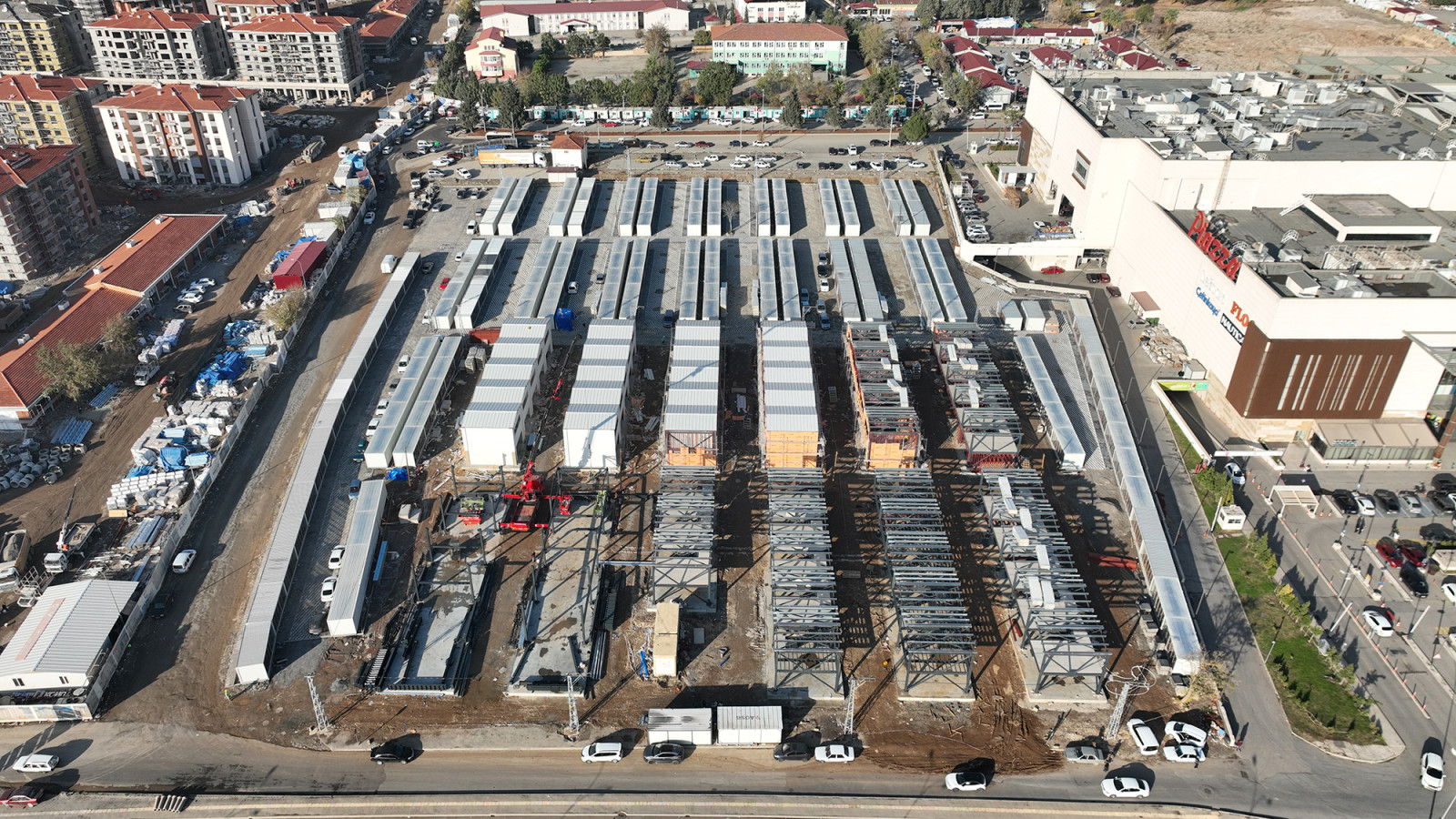 Şehir merkezindeki rezerv alanında yer alan esnaflar için Piazza AVM yanında yapımına başlanan geçici çarşıda konteyner ve çelik konstrüksiyon iş yerlerinin kurulumunda sona gelindi.