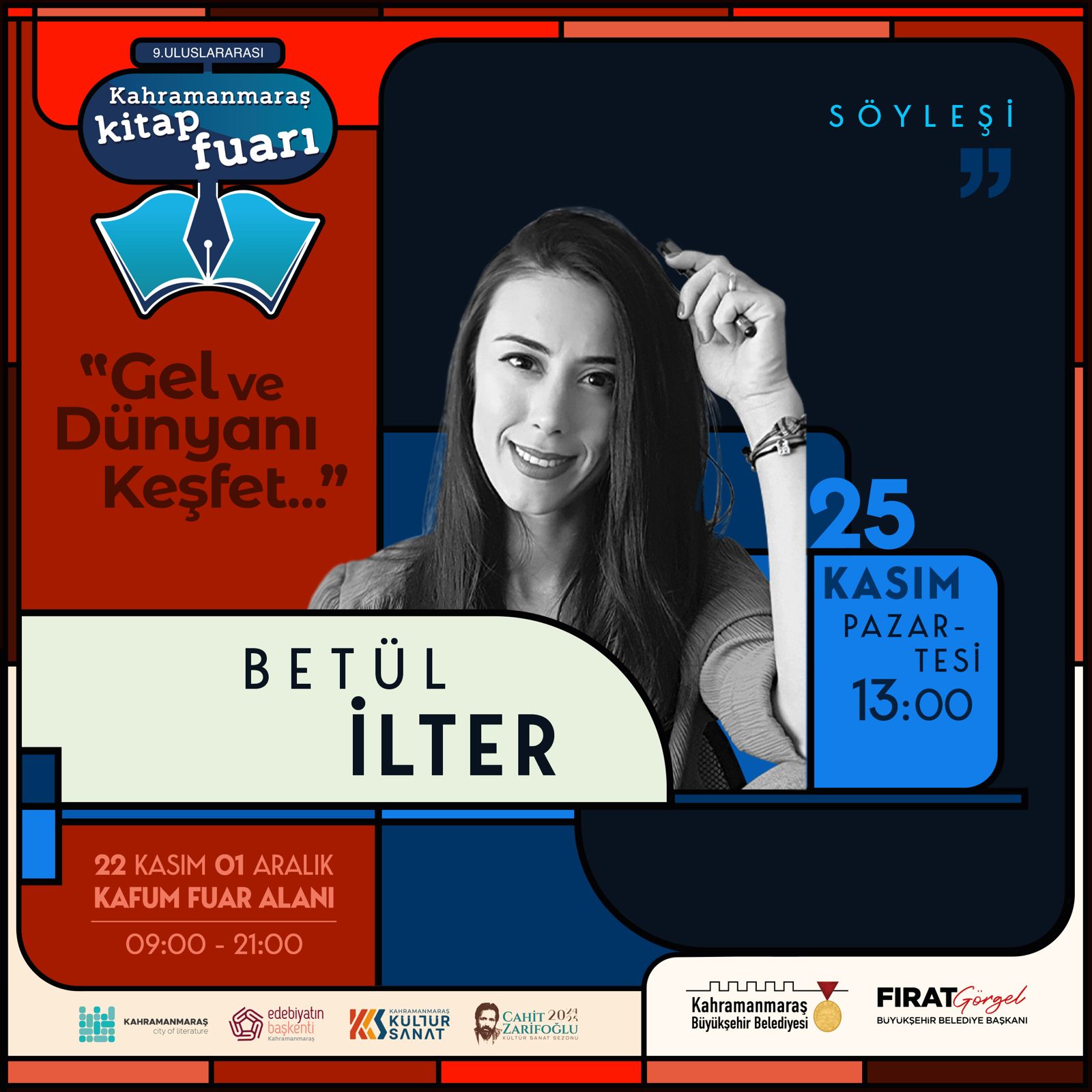 Kahramanmaraş Büyükşehir Belediyesinin düzenlediği ve büyük bir ilgiyle takip edilen 9. Uluslararası Kitap Fuarı, KAFUM Fuar Alanı’nda edebiyatseverleri ağırlamaya devam ediyor. 25 Kasım Pazartesi günü, birbirinden değerli yazarların katılacağı söyleşiler, imza günleri ve çeşitli etkinliklerle tam bir edebiyat şöleni yaşanacak. Edebiyat tutkunlarının yoğun katılım gösterdiği fuarın Pazartesi programı, ünlü yazarların söyleşileriyle dikkat çekiyor. Saat 13.00’da başarılı yazar Betül İlter, okurlarıyla bir araya gelerek yazarlık serüvenini ve edebiyata dair bakış açısını paylaşacak. 14.00’da iki değerli isim İhsan Süreyya Sırma ve Hacı Bayram Karaçor, aynı oturumda edebiyat, tarih ve kültür üzerine keyifli bir söyleşi gerçekleştirecek. Şiirleri ve etkileyici anlatımıyla tanınan Nurullah Genç, saat 16.00’da okurlarına unutulmaz bir edebiyat deneyimi sunacak. Saat 17.00’da gerçekleştirilecek söyleşide ise Ali Büyükçapar, edebiyat dünyasına dair düşüncelerini ve eserlerinden ilham verici detayları katılımcılarla paylaşacak.