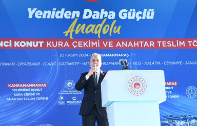 Cumhurbaşkanı Recep Tayyip Erdoğan'ın teşrifleriyle Merkez Spor Kompleksi'nde gerçekleştirilen "155 Bininci Konut Kura Çekimi ve Anahtar Teslim Töreni" büyük bir coşkuya sahne oldu. Binlerce vatandaşın katılımıyla gerçekleştirilen törende, tamamlanan Kahramanmaraş'ta 3 bin 499, deprem bölgesinde ise toplam 24 bin 559 konutun kurası çekilerek hak sahiplerine teslim edildi. Cumhurbaşkanı Recep Tayyip Erdoğan'dan önce kürsüye gelerek Kahramanmaraşlılara seslenen İçişleri Bakanı Ali Yerlikaya, Çevre, Şehircilik ve İklim Değişikliği Bakanı Murat Kurum, Aile ve Sosyal Hizmetler Bakanı Mahinur Özdemir Göktaş ile Gençlik ve Spor Bakanı Osman Aşkın Bak, bakanlık alanında gerçekleştirilen yatırımlara ilişkin katılımcılara bilgiler aktardı.