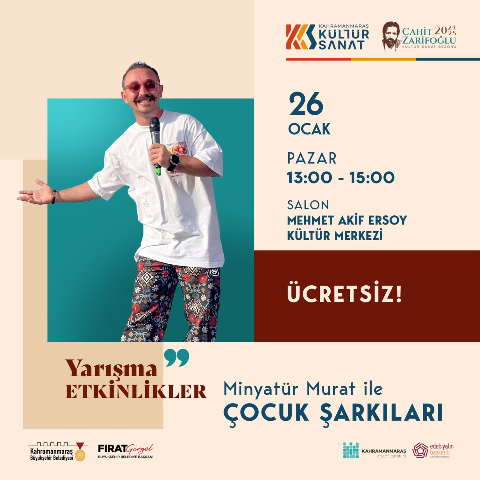 Etkinliklerin son günü olan 26 Ocak Pazar günü ise çocukları birbirinden eğlenceli yarışmalar bekliyor. Mehmet Akif Ersoy Kültür Merkezi’nde saat 13.00 ve 15.00’da düzenlenecek bu etkinlikler, sunucu Minyatür Murat’ın keyifli anlatımıyla şenlenecek. Yarışmalarla çocuklar hem yeteneklerini sergileme hem de yeni arkadaşlıklar kurma fırsatı bulacak.