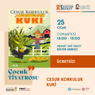 25 Ocak Cumartesi günü ise çocuk tiyatrosunun sevilen oyunlarından biri olan “Cesur Korkuluk Kuki” sahne alacak. Mehmet Akif Ersoy Kültür Merkezi’nde yine saat 13.00 ve 15.00’da gerçekleşecek iki seansla çocuklar, eğlencenin ve tiyatro sanatının tadını çıkaracak. Renkli sahne dekorları ve etkileyici hikâyesiyle “Cesur Korkuluk Kuki”, minik izleyicileri büyülemeye hazırlanıyor.