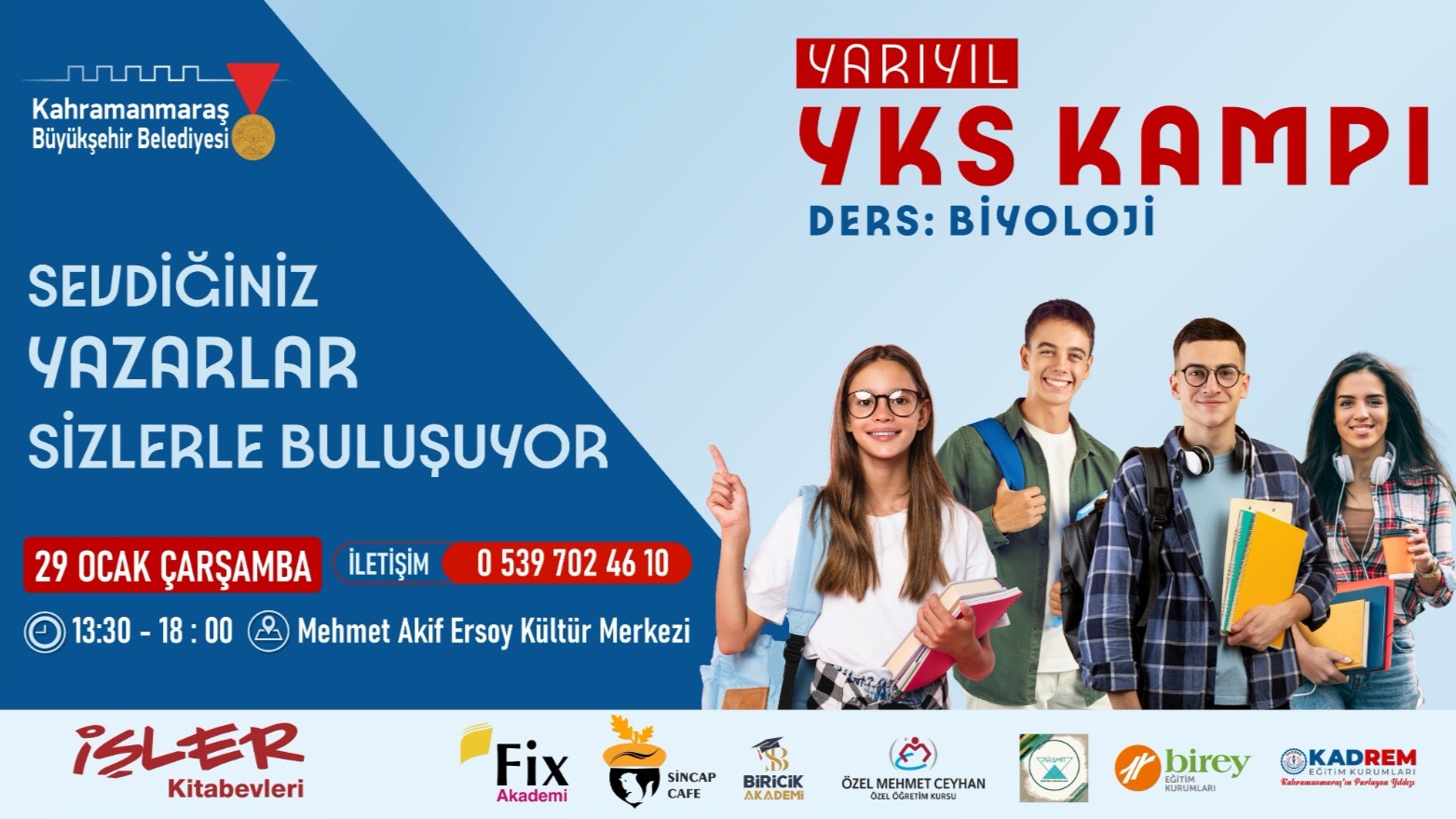 Büyükşehir Belediyesinin ücretsiz YKS kampı, 29 Ocak Çarşamba günü Biyoloji dersiyle devam edecek. 13.30 – 18.00 saatleri arasında Mehmet Akif Ersoy Kültür Merkezi’nde gerçekleştirilecek programda; Aslan Aydın, Murat Sarıışık ve Engin Önüç, öğrencilerle buluşacak.